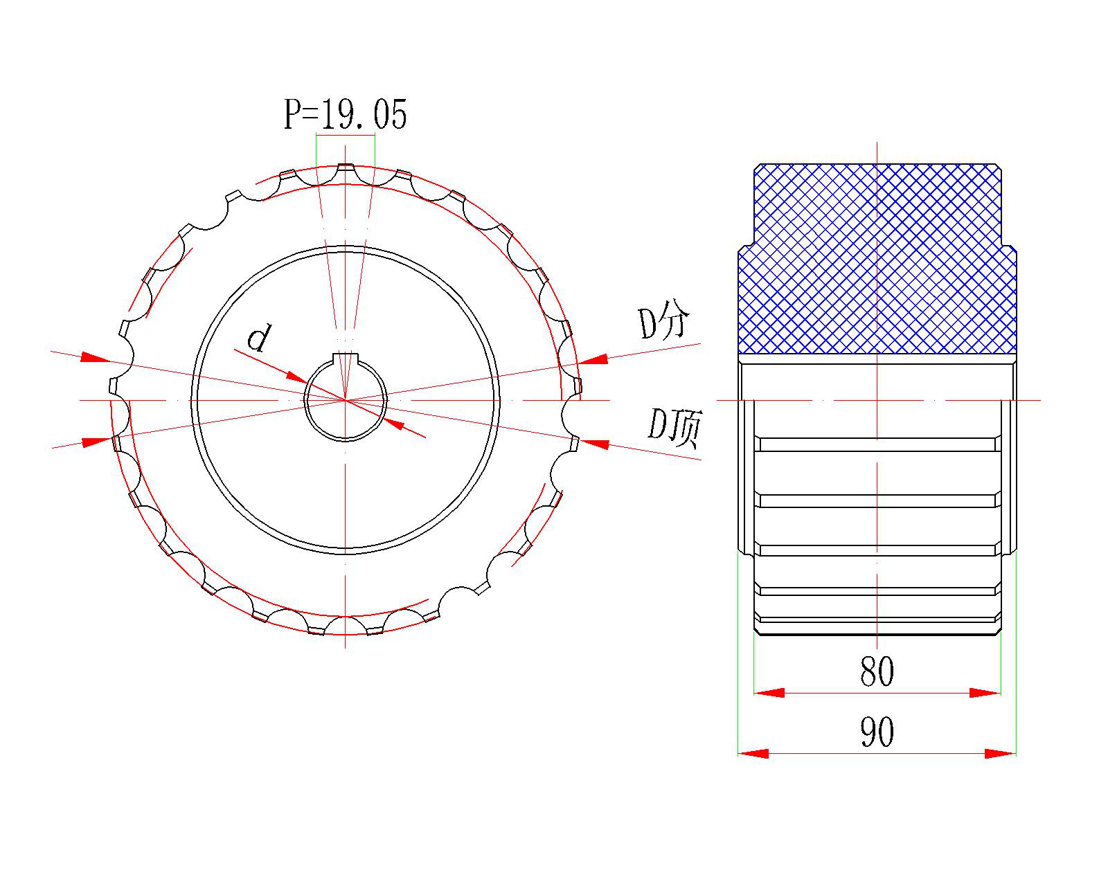 | 鏈輪型號 | 齒數(shù) | D分(mm) | D頂(mm) | d孔徑(mm) |