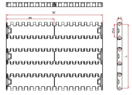 2.材質(zhì):網(wǎng)帶材質(zhì):聚甲醛(POM);銷軸材質(zhì):聚丙烯(PP)